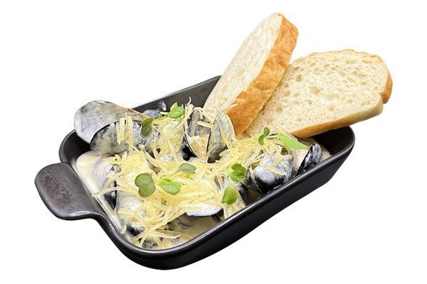 мидии двустворчатые, сливки, чиабатта, руккола, сыры: чеддер, пармезан, с голубой плесенью, моцарелла