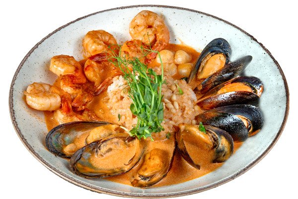 лангустины, мидии, креветки и гребешки в соусе том ям, подается с рисом и кедровыми орешками