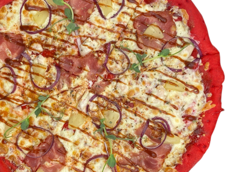 моцарелла, соус барбекю, ананас, филе куриного бедра, бекон, красный лук