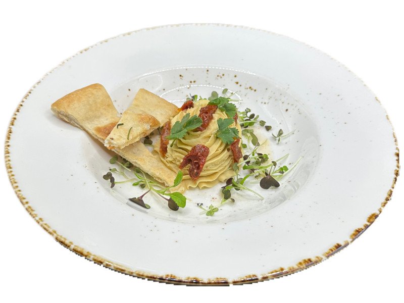 турецкий горох, чеснок, паста тахини из кунжута, масло аджичное, вяленые томаты, кунжут, лепешка, кинза